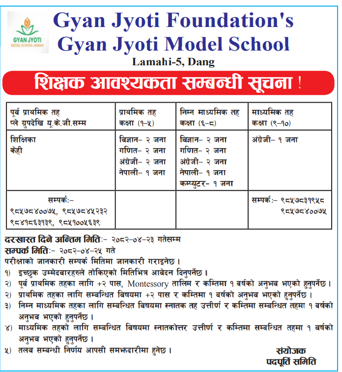 Teachers – Science, Math, English, Nepali, Computer Full Time Dang Posted 7 months ago Applications have closed Gyan Jyoti Model School JOB OPPORTUNITY Source: Naya Youg Bodh, 4 August, 2025 Tagged as: Dang