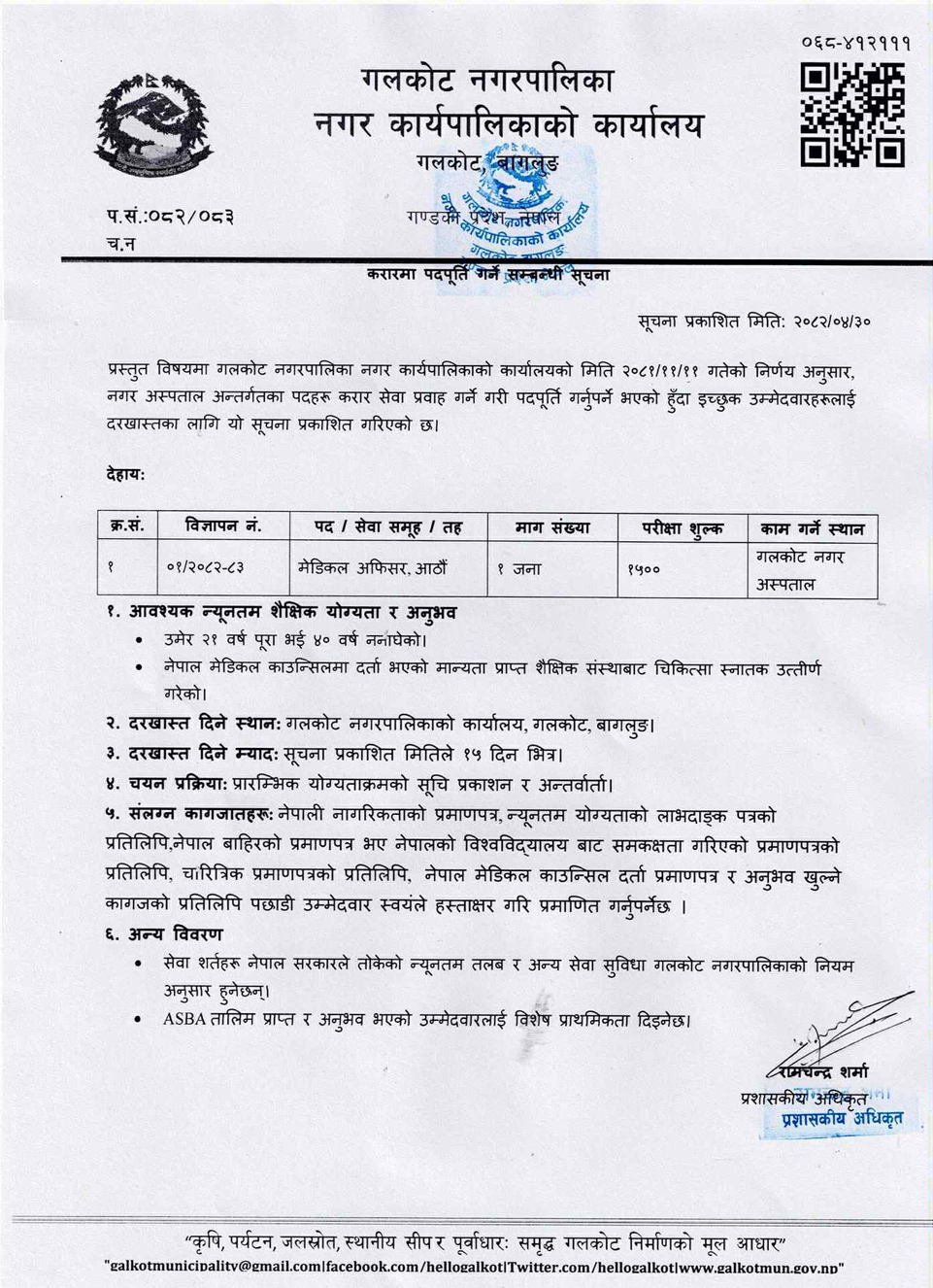 Medical Officer Full Time Baglung Posted 7 months ago Applications have closed Website Galkot Nagarpalika JOB OPPORTUNITY Position: Medical Officer No. of Vacancy: 1 Location: Baglung Galkot Nagarpalika Tagged as: Baglung