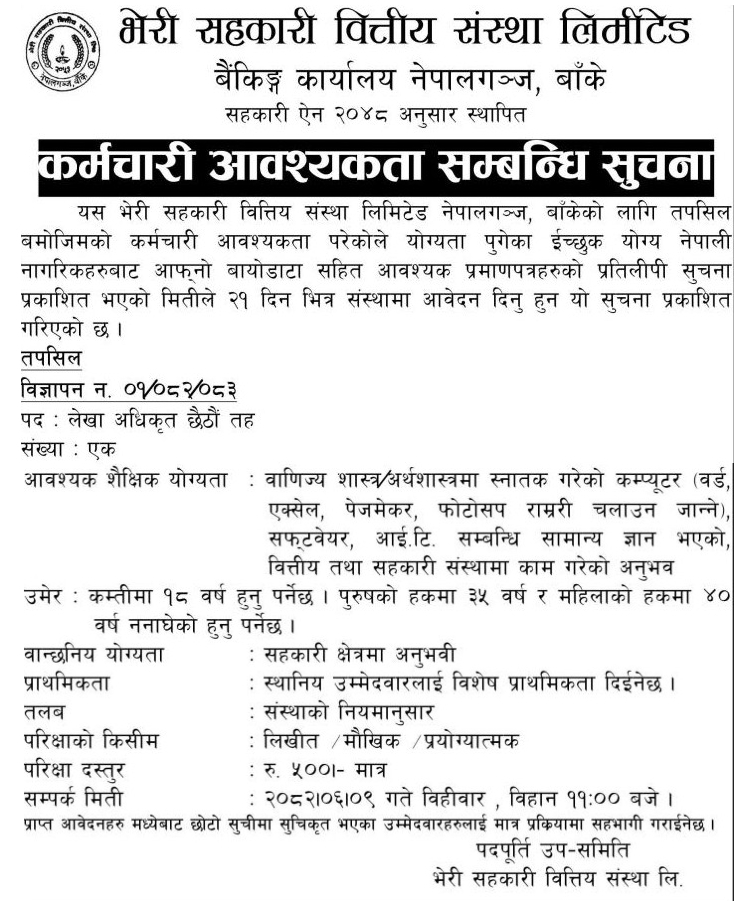Account Officer Full Time Banke Posted 3 months ago Bheri Cooperative Finance Organisation Ltd JOB OPPORTUNITY Position: Account Officer No. of Vacancy: 1 Location: Nepalgunj, Banke Bheri Cooperative Finance Organisation Ltd Tagged as: Banke