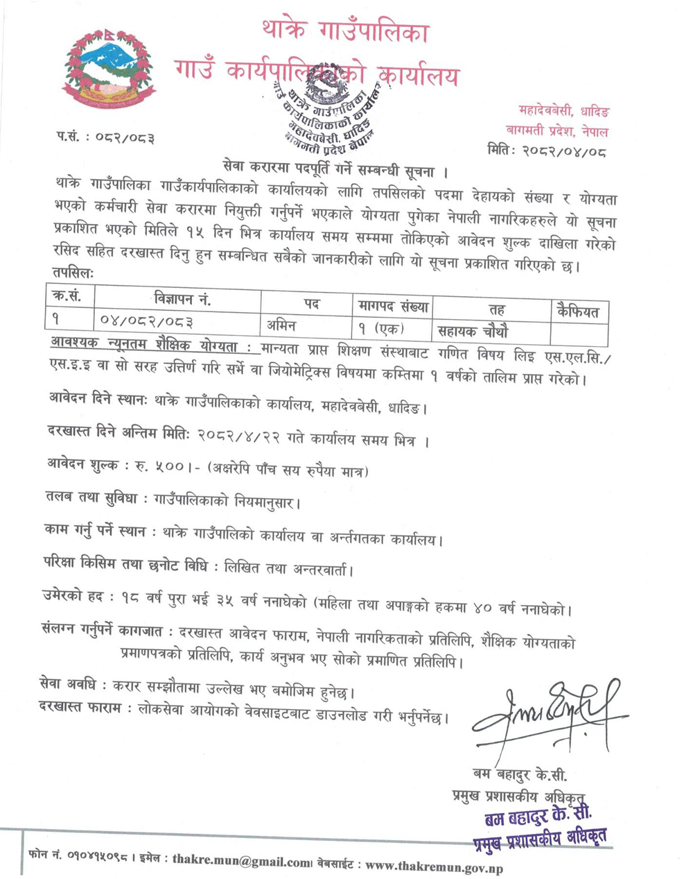 Amin Full Time Dhading Posted 4 months ago Applications have closed Website Thakre Gaunpalika JOB OPPORTUNITY Position: Amin No. of Vacancy: 1 Location: Dhading Thakre Gaunpalika Tagged as: Dhading
