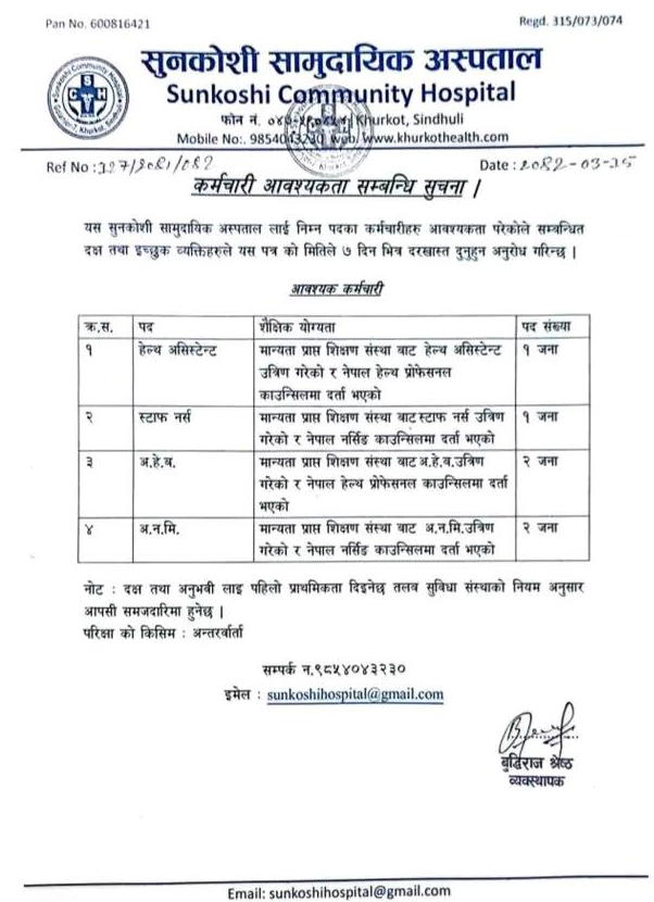 ANM, AHW, Staff Nurse, Health Assistant Full Time Sindhuli Posted 5 months ago Applications have closed Sunkoshi Community Hospital JOB OPPORTUNITY