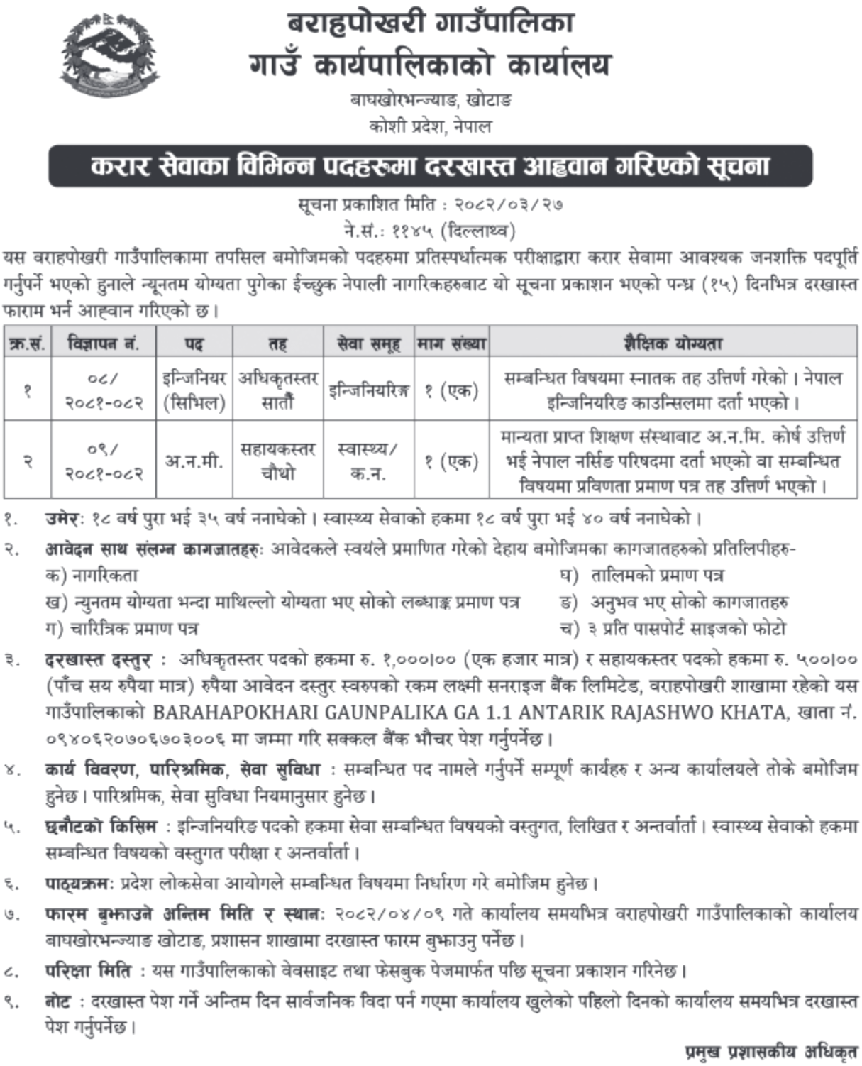 ANM, Civil Engineer Full Time Khotang Posted 5 months ago Applications have closed Website Baraha Pokhari Gaunpalika JOB OPPORTUNITY Tagged as: Khotang