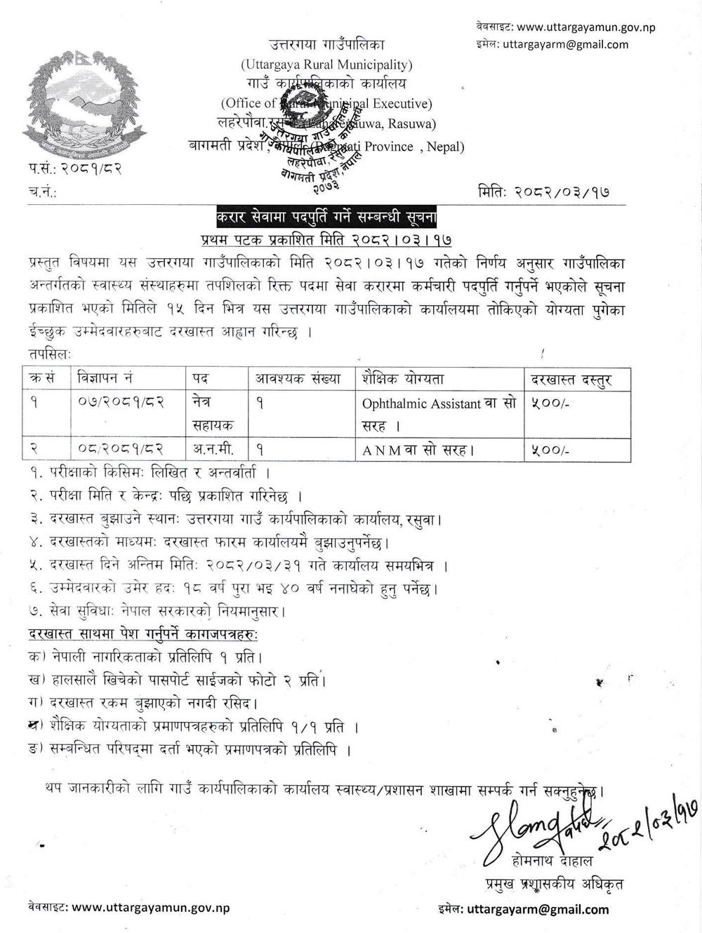 ANM, Ophthalmic Assistant Full Time Rasuwa Posted 5 months ago Applications have closed Website Uttargaya Gaunpalika JOB OPPORTUNITY