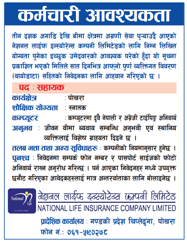 Assistant Full Time Pokhara Posted 5 months ago Applications have closed Website National Life Insurance Company Limited JOB OPPORTUNITY Source: Samadhan News, 28 August, 2025 Tagged as: Pokhara
