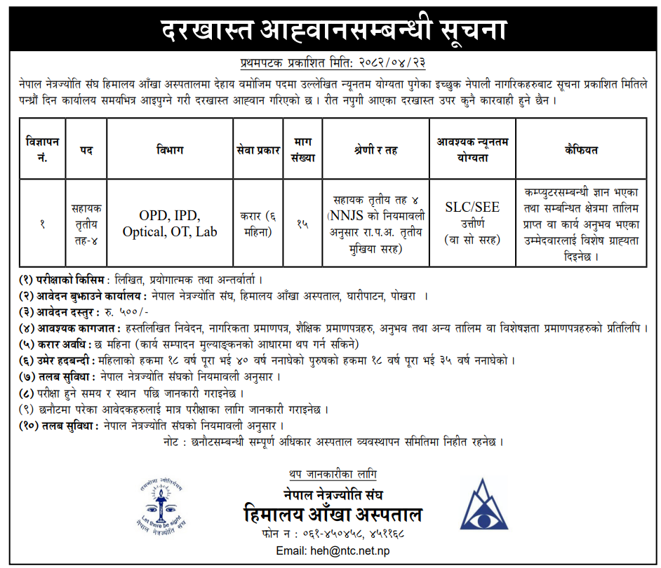 Assistant Level Full Time Pokhara Posted 4 months ago Nepal Netra Jyoti Sangh, Himalaya Eye Hospital JOB OPPORTUNITY Tagged as: Pokhara