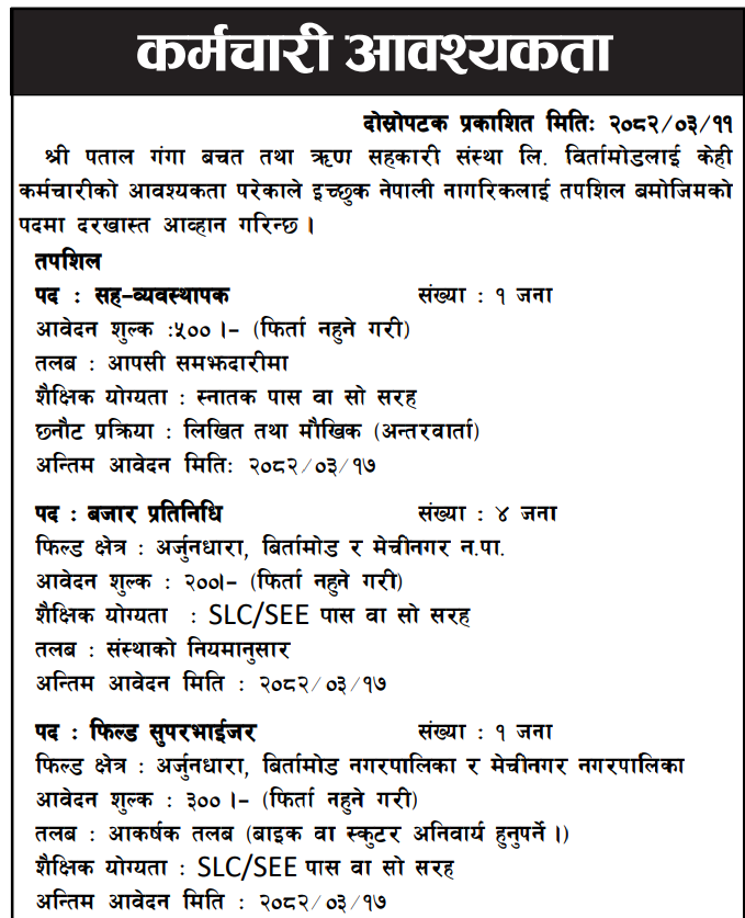 Assistant Manager, Market Representative Full Time Jhapa Posted 5 months ago Applications have closed Patal Ganga Saving and Credit Cooperative Ltd. JOB OPPORTUNITY Source: Purwanchal Daily, 25 June, 2025