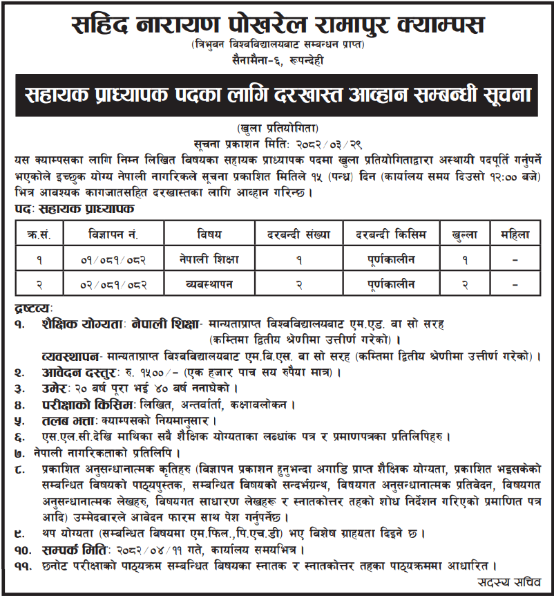 Assistant Professor – Nepali Education, Management Full Time Rupandehi Posted 5 months ago Applications have closed Sahid Narayan Pokharel Ramapur Campus JOB OPPORTUNITY Tagged as: Rupandehi