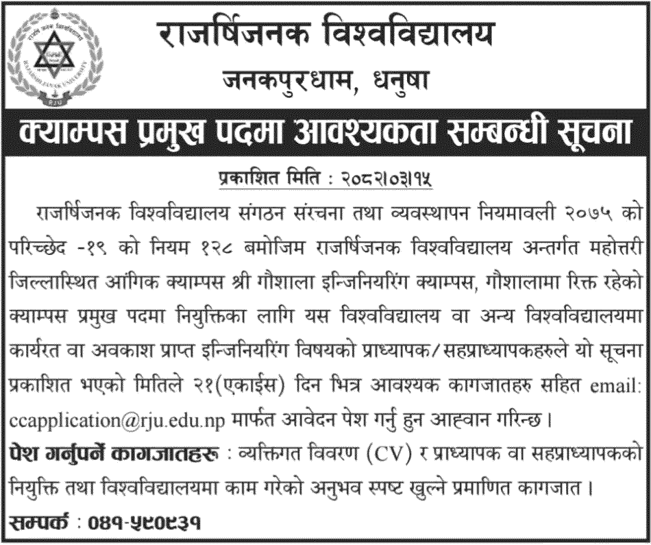 Campus Chief Full Time Dhanusha Posted 5 months ago Applications have closed Website Rajarshi Janak University JOB OPPORTUNITY