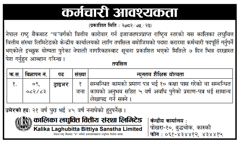Driver Full Time Pokhara Posted 3 months ago Applications have closed Website Kalika Laghubitta Bittiya Sanstha Limited JOB OPPORTUNITY Position: Driver No. of Vacancy: 1 Location: Pokhara Kalika Laghubitta Bittiya Sanstha Limited Phone No.: 061-434412, 434415 Tagged as: Pokhara
