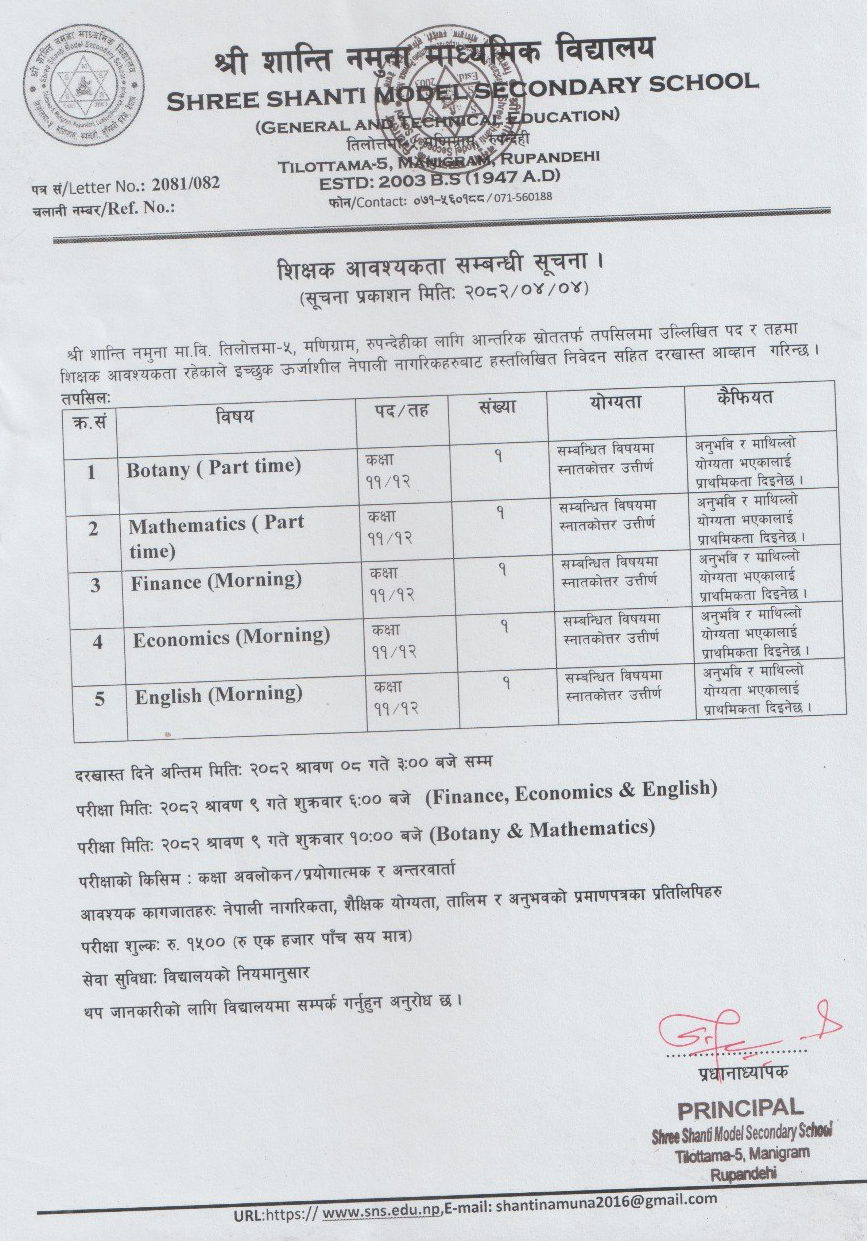 Position: Botany Teacher (Part Time)
