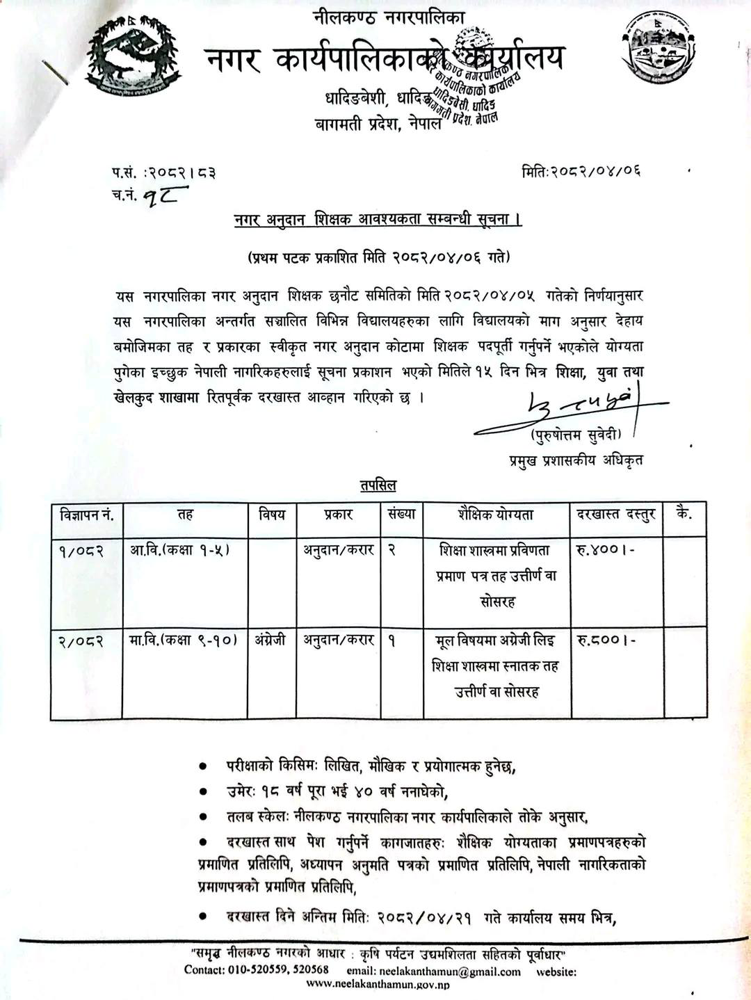 English Teacher, Education Teacher Full Time Dhading Posted 4 months ago Applications have closed Website Neelakantha Nagarpalika JOB OPPORTUNITY Tagged as: Dhading