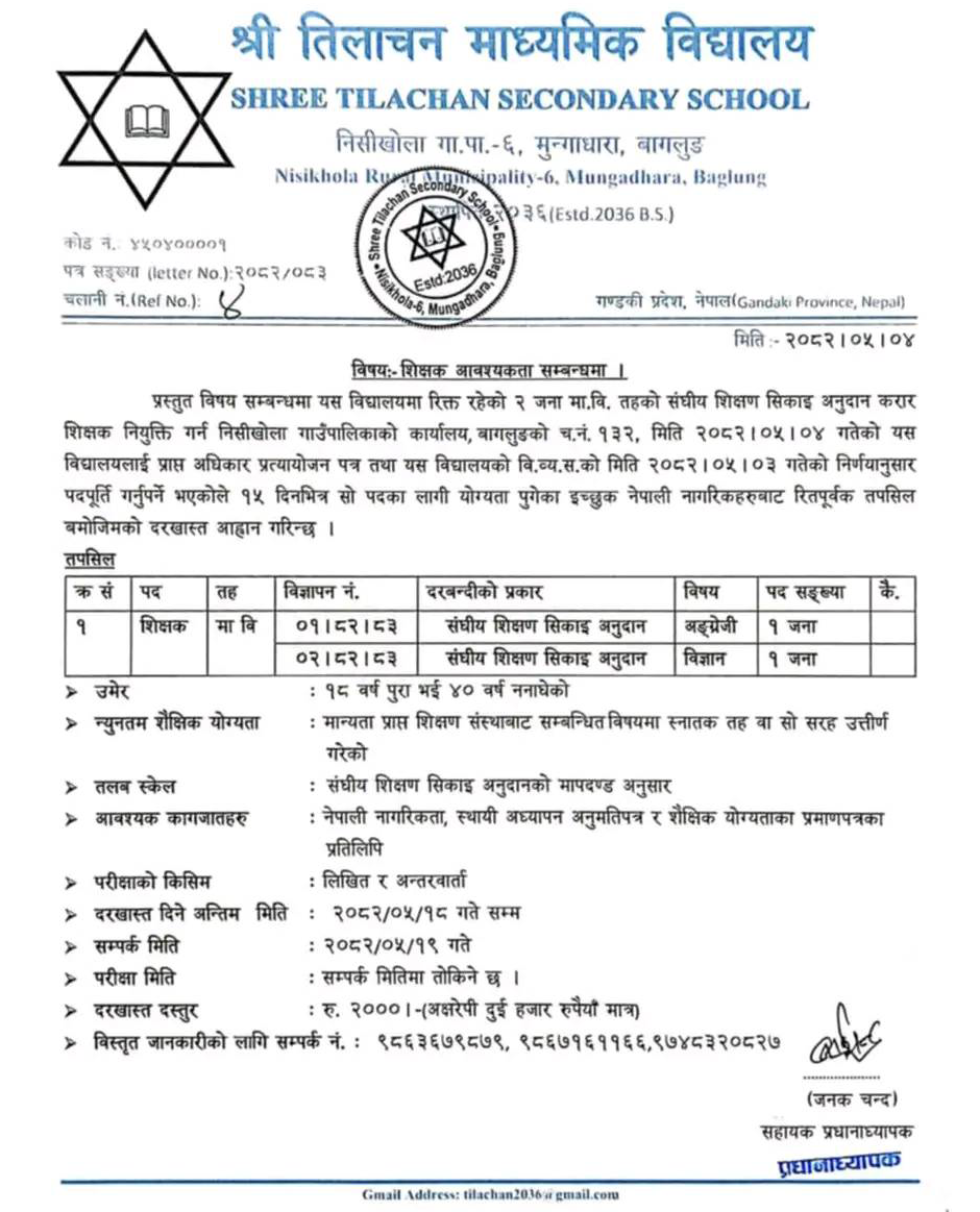 English Teacher, Science Teacher Full Time Baglung Posted 5 months ago Applications have closed Shree Tilachan Madhyamik Vidyalaya JOB OPPORTUNITY Position: Teacher Subject: English Level: Secondary No. of Vacancy: 1 Position: Teacher Subject: Science Level: Secondary No. of Vacancy: 1 Location: Baglung Shree Tilachan Madhyamik Vidyalaya Phone No.: 9863679879, 9867161166 Tagged as: Baglung