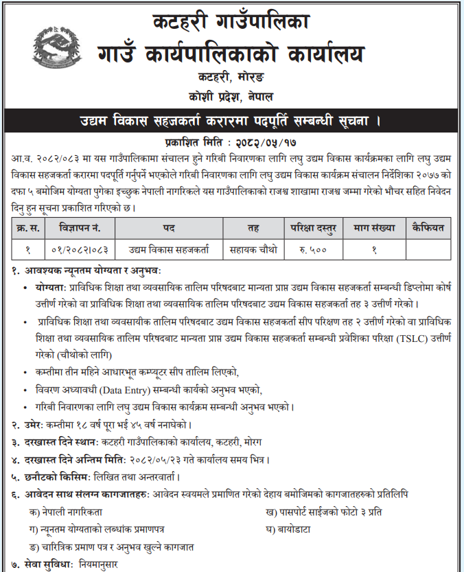 Enterprise Development Facilitator Full Time Morang Posted 3 months ago Applications have closed Website Katahari Gaunpalika JOB OPPORTUNITY Position: Enterprise Development Facilitator No. of Vacancy: 1 Location: Morang Katahari Gaunpalika Tagged as: Morang