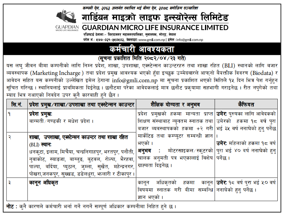 Marketing Incharge, Province Head Full Time Anywhere Posted 4 months ago Applications have closed Guardian Micro Life Insurance Limited JOB OPPORTUNITY
