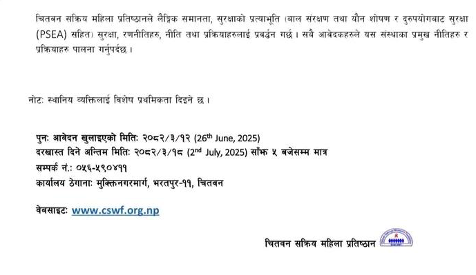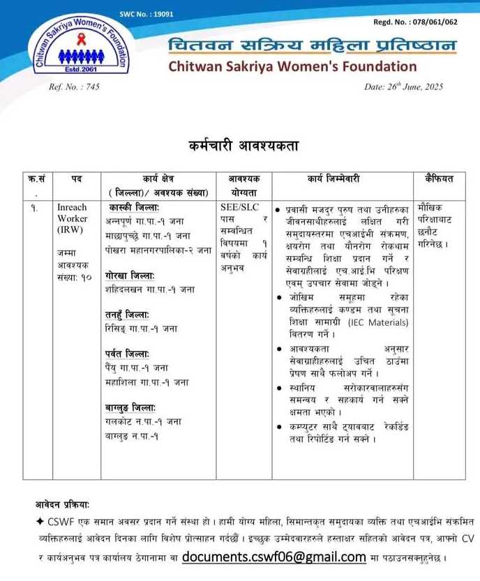Inreach Worker Full Time Chitwan Posted 5 months ago Applications have closed Website Chitwan Sakriya Women's Foundation JOB OPPORTUNITY