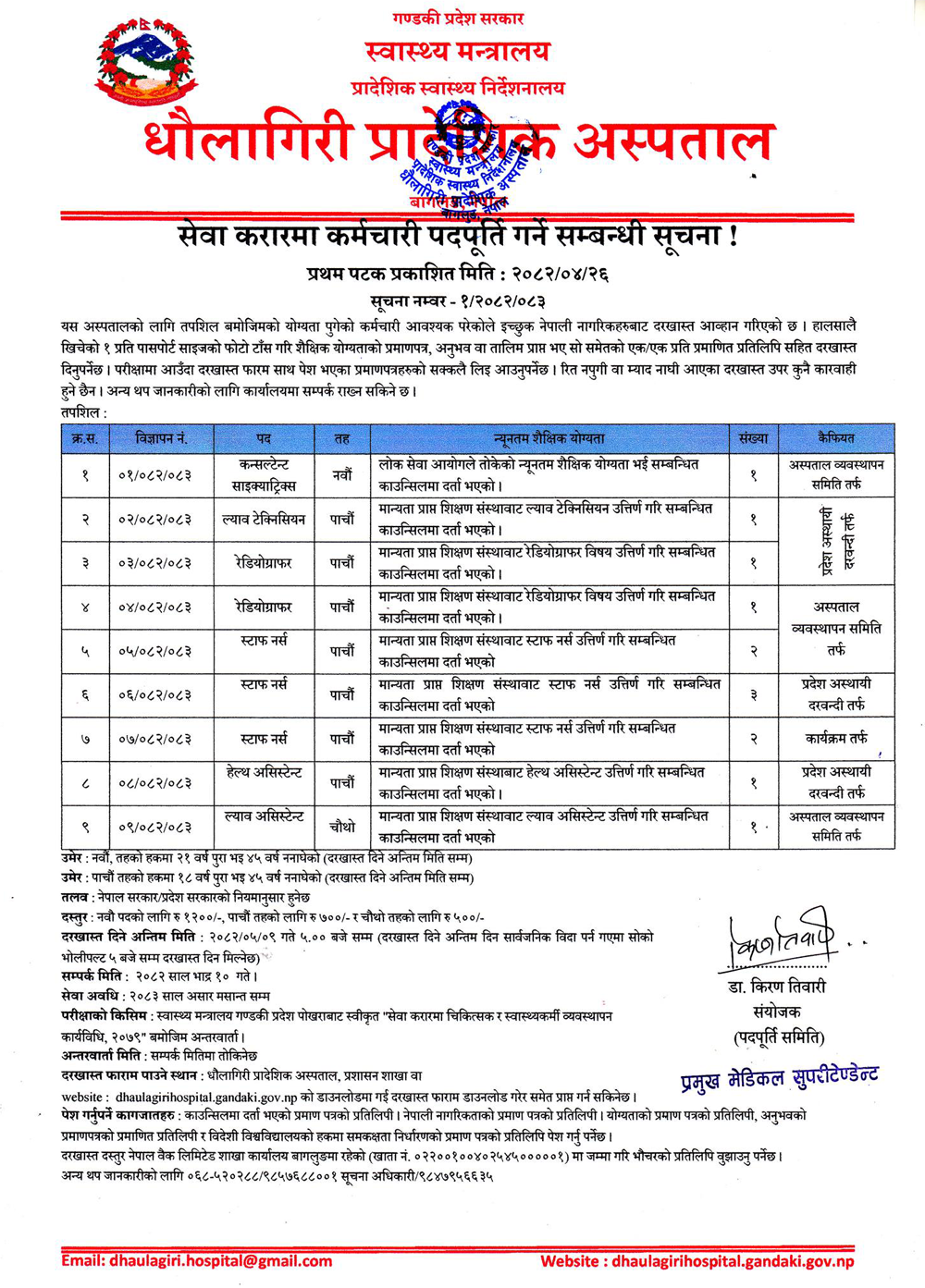 Lab Assistant, Health Assistant, Staff Nurse, Radiographer, Lab Technician Full Time Baglung Posted 4 months ago Applications have closed Website Dhaulagiri Provincial Hospital JOB OPPORTUNITY Tagged as: Baglung