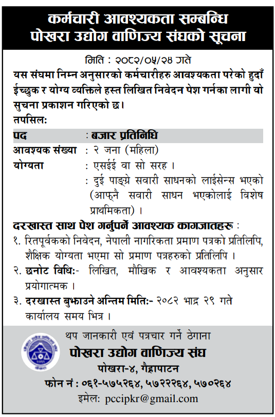 Market Representative Full Time Pokhara Posted 3 months ago Applications have closed Pokhara Chamber of Commerce and Industry JOB OPPORTUNITY Position: Market Representative No. of Vacancy: 2 Location: Pokhara Pokhara Chamber of Commerce and Industry Phone No.: 061575264, 5722264, 570264 Email: pccipkr@gmail.com Tagged as: Pokhara