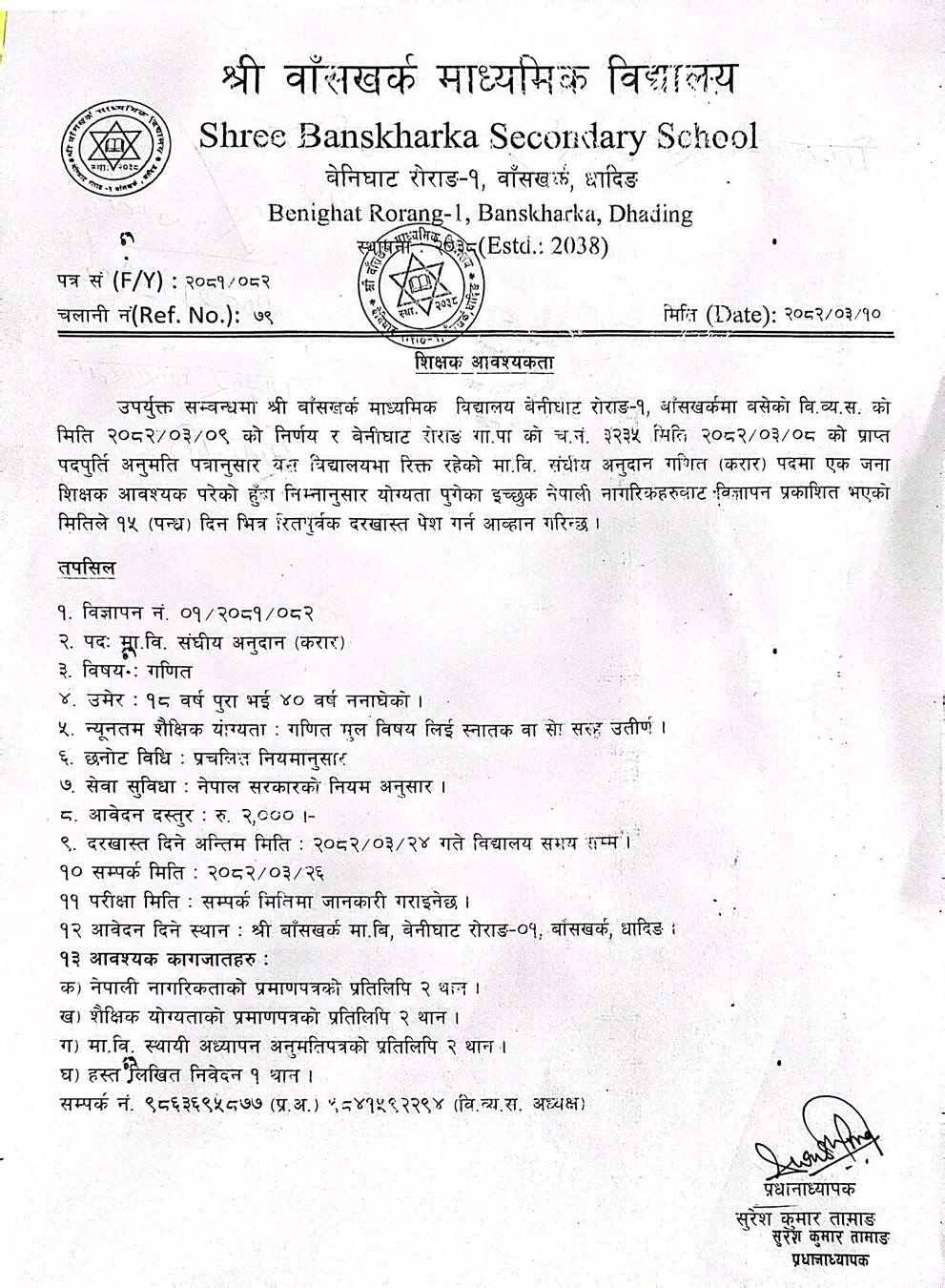 Math Teacher Full Time Dhading Posted 5 months ago Applications have closed Shree Banskharka Madhyamik Vidyalaya JOB OPPORTUNITY