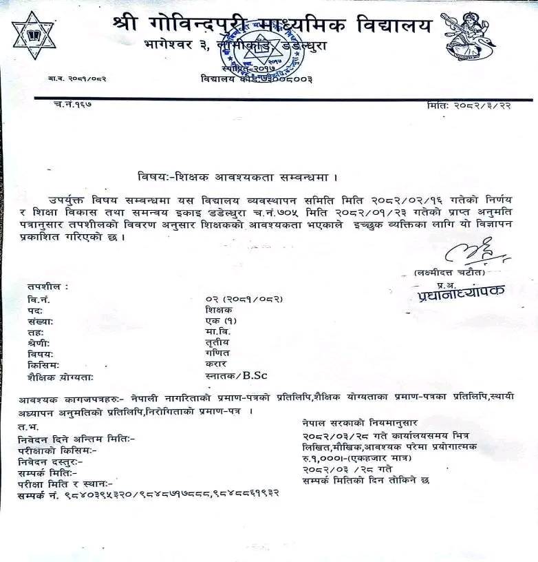 Math Teacher Full Time Dadeldhura Posted 5 months ago Applications have closed Shree Govindpuri Madhyamik Vidyalaya JOB OPPORTUNITY