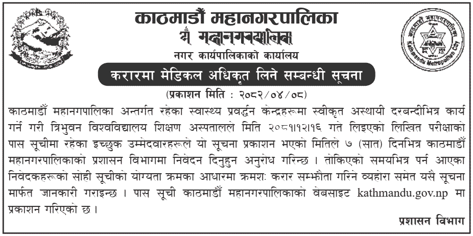 Medical Officer Full Time Kathmandu Posted 4 months ago Applications have closed Website Kathmandu Metropolitan City JOB OPPORTUNITY Source: Gorkhapatra, 24 July, 2025 Tagged as: Kathmandu