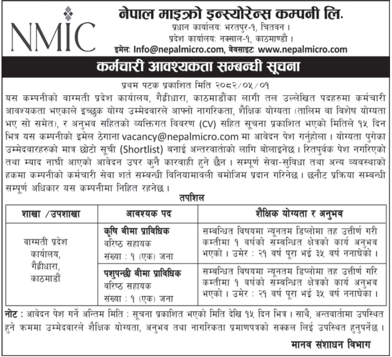 Senior Assistant Full Time Anywhere Posted 4 months ago Applications have closed Website Nepal Micro Insurance Company Ltd. JOB OPPORTUNITY