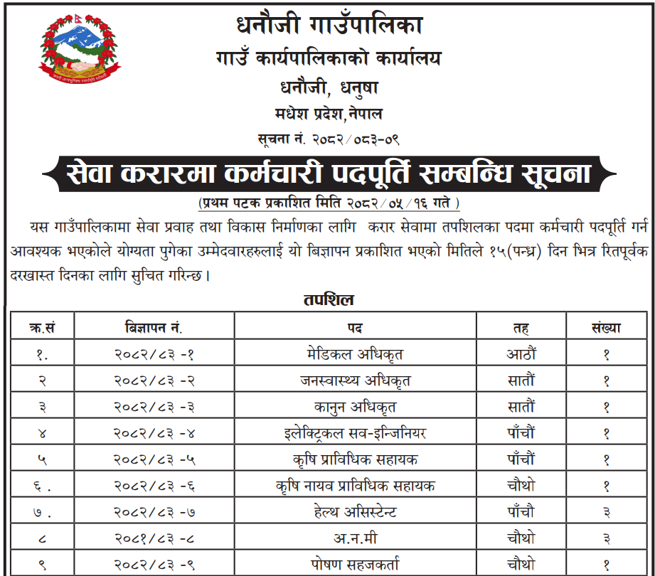 Nutrition Facilitator, ANM, Health Assistant, Agriculture Deputy Technical Assistant, Agricultural Technical, Electrical Engineer, Law Officer, Public Health Officer, Medical Officer