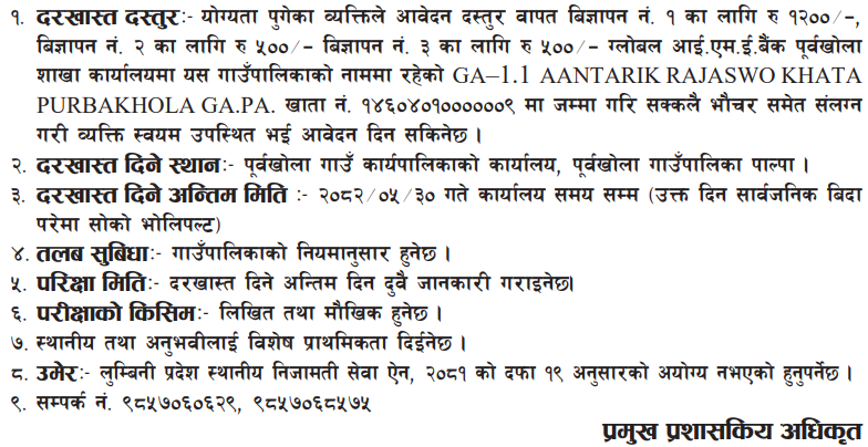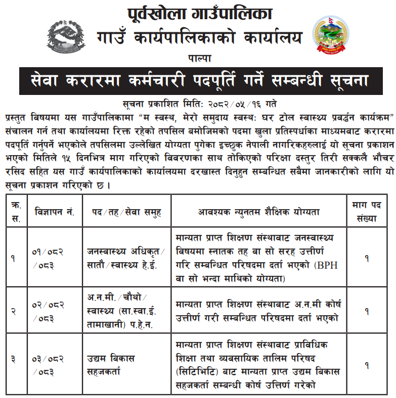 Nutrition Facilitator, ANM, Public Health Officer Full Time Palpa Posted 3 months ago Applications have closed Website Purbakhola Gaunpalika JOB OPPORTUNITY Position: Public Health Officer No. of Vacancy: 1 Position: ANM No. of Vacancy: 1 Position: Nutrition Facilitator No. of Vacancy: 1 Location: Palpa Purbakhola Gaunpalika Phone No.: 9857060629, 9857068575 Tagged as: Palpa