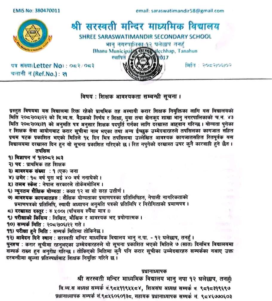 Primary Level Teacher Full Time Tanahun Posted 2 months ago Applications have closed Shree Saraswati Mandir Madhyamik Vidyalaya JOB OPPORTUNITY Position: Teacher Level: Primary Number of Openings: 1 Location: Tanahun Shree Saraswati Mandir Madhyamik Vidyalaya Phone No.: 9851195584, 9818319697, 9856060138, 9846770603 Tagged as: Tanahun