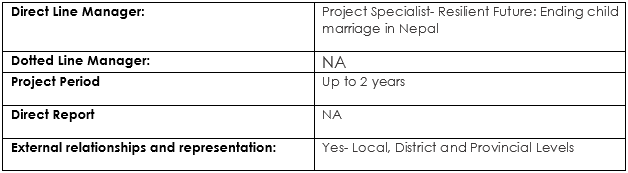 Reports to: Direct: Project Specialist- Resilient Future: Ending child marriage in Nepal