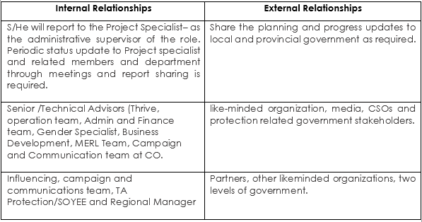 - Supports in program areas to build strong networks with other NGOs, CSOs, bilateral and multi-lateral agencies and Government line agencies working on Protection (Especially in the trafficking) issues to promote coordination and resource sharing at the Palikas/districts/province level.