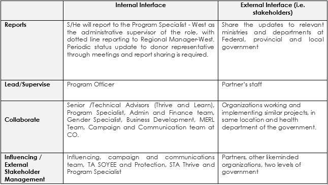 The PS is a member of Programme, Partnership, and Impact (PPI) Department and works closely with Programme Quality and Innovation Unit (PQI) including Monitoring, Evaluation Research and Learning (MERL) unit, Business Development Department (for grants compliance/donor reporting), Influencing, Campaigns and Communications (ICC) team with regards to quality program, program effectiveness and efficiency.