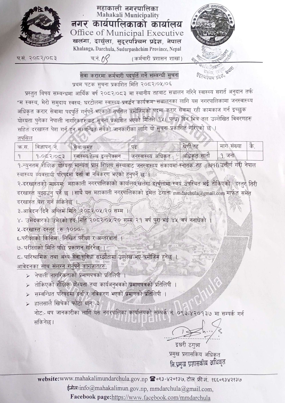 Public Health Officer Full Time Darchula Posted 3 months ago Applications have closed Mahakali Nagarpalika JOB OPPORTUNITY Position: Public Health Officer No. of Vacancy: 1 Location: Darchula Mahakali Nagarpalika Phone No.: 093-420137 Tagged as: Darchula