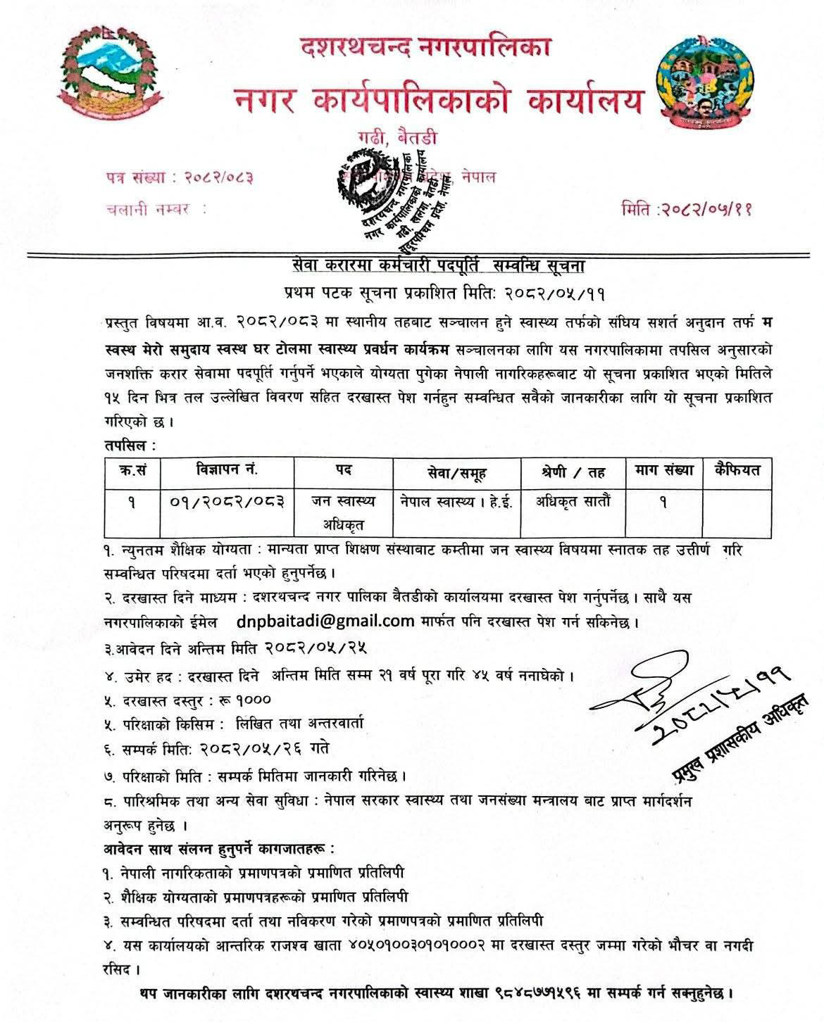 Public Health Officer Full Time Baitadi Posted 3 months ago Applications have closed Website Dashrathchand Nagarpalika JOB OPPORTUNITY Position: Public Health Officer No. of Vacancy: 1 Location: Baitadi Dashrathchand Nagarpalika Email: dnpbaitadi@gmail.com Tagged as: Baitadi