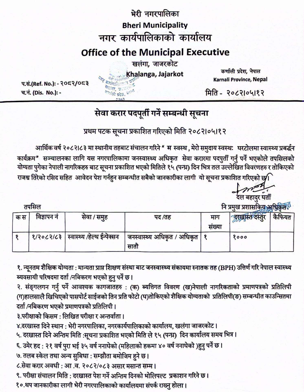 Public Health Officer Full Time Jajarkot Posted 3 months ago Applications have closed Website Bheri Nagarpalika JOB OPPORTUNITY Position: Public Health Officer No. of Vacancy: 1 Location: Jajarkot Bheri Nagarpalika Tagged as: Jajarkot