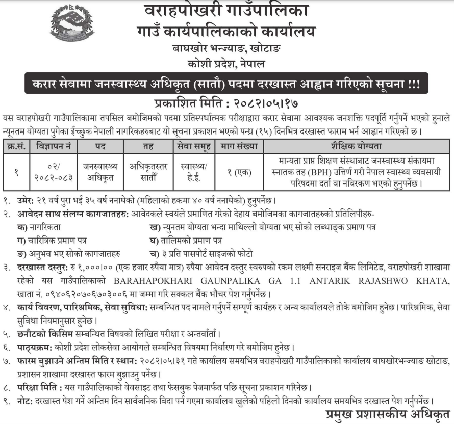 Public Health Officer Full Time Khotang Posted 3 months ago Applications have closed Website Barahapokhari Gaunpalika JOB OPPORTUNITY Tagged as: Khotang