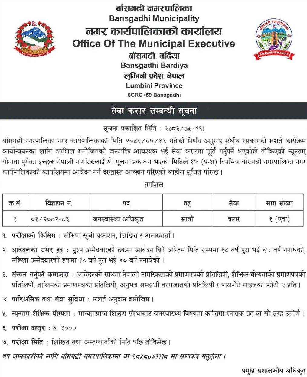 Public Health Officer Full Time Bardiya Posted 3 months ago Applications have closed Website Bansgadhi Nagarpalika JOB OPPORTUNITY Position: Public Health Officer No. of Vacancy: 1 Location: Bardiya Bansgadhi Nagarpalika Phone No.: 9858071118 Tagged as: Bardiya