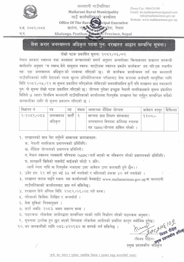 Public Health Officer Full Time Pyuthan Posted 4 months ago Applications have closed Website Mallarani Gaunpalika JOB OPPORTUNITY Position: Public Health Officer No. of Vacancy: 1 Location: Pyuthan Mallarani Gaunpalika Website: www.mallaranimun.gov.np Phone No.: 086-420180 Tagged as: Pyuthan