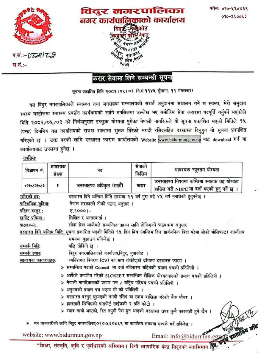 Public Health Officer Full Time Nuwakot Posted 3 months ago Applications have closed Bidur Nagarpalika JOB OPPORTUNITY Position: Public Health Officer No. of Vacancy: 1 Location: Nuwakot Bidur Nagarpalika Website: www.bidurmun.gov.np Phone No.: 010-560469 Tagged as: Nuwakot