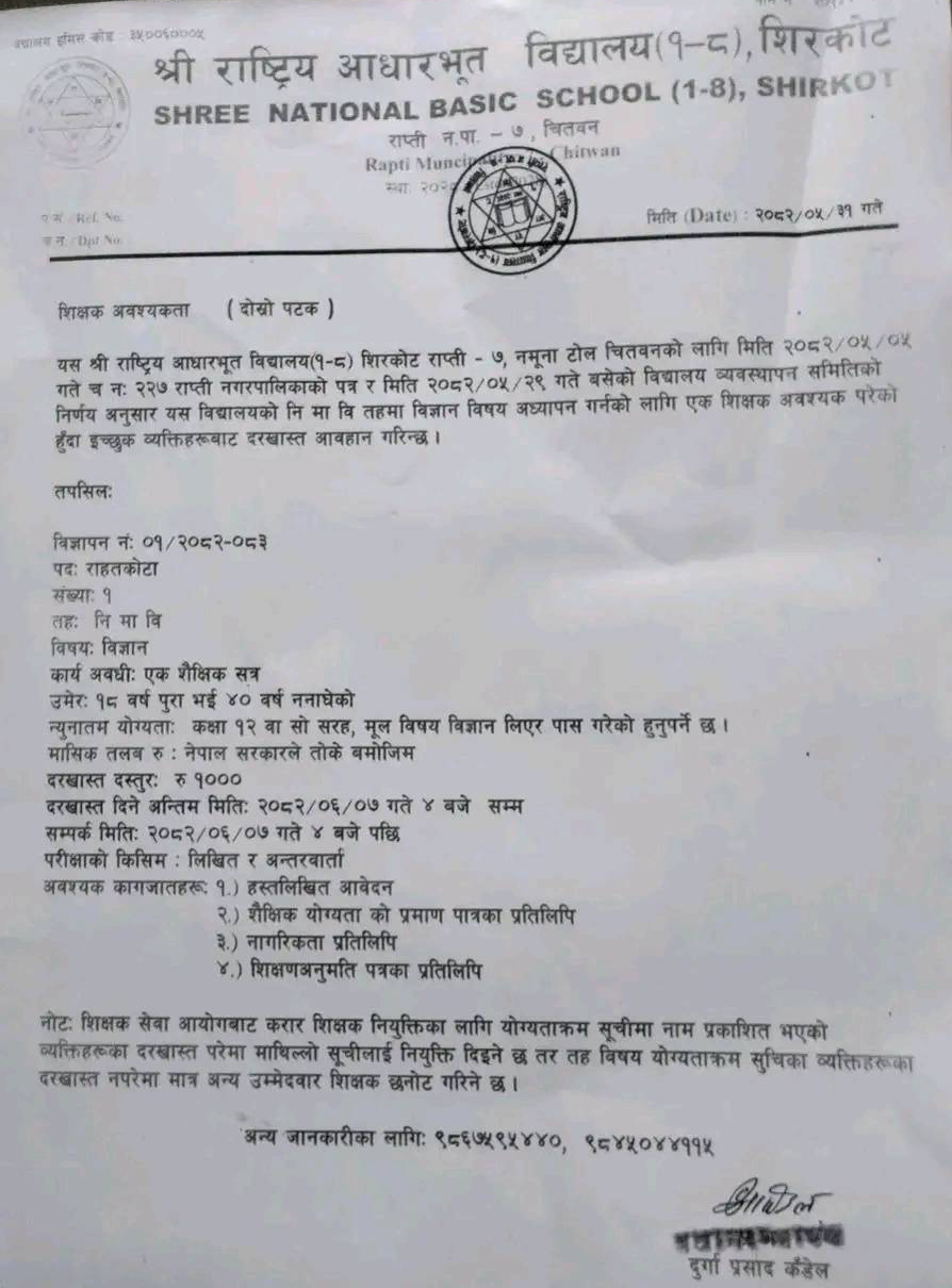 Science Teacher Full Time Chitwan Posted 4 months ago Applications have closed Shree National Basic School JOB OPPORTUNITY Position: Teacher Level: Lower Secondary Subject: Science No. of Vacancy: 1 Location: Chitwan Shree National Basic School Phone No.: 9867595440, 9845044115 Tagged as: Chitwan