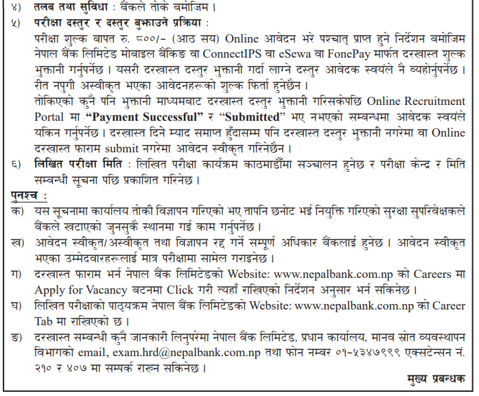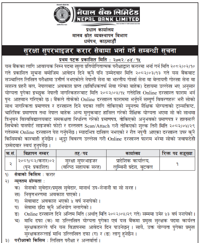 Security Supervisor Full Time Anywhere Posted 4 months ago Applications have closed Website Nepal Bank Ltd JOB OPPORTUNITY Source: Gorkhapatra, 31 July, 2025