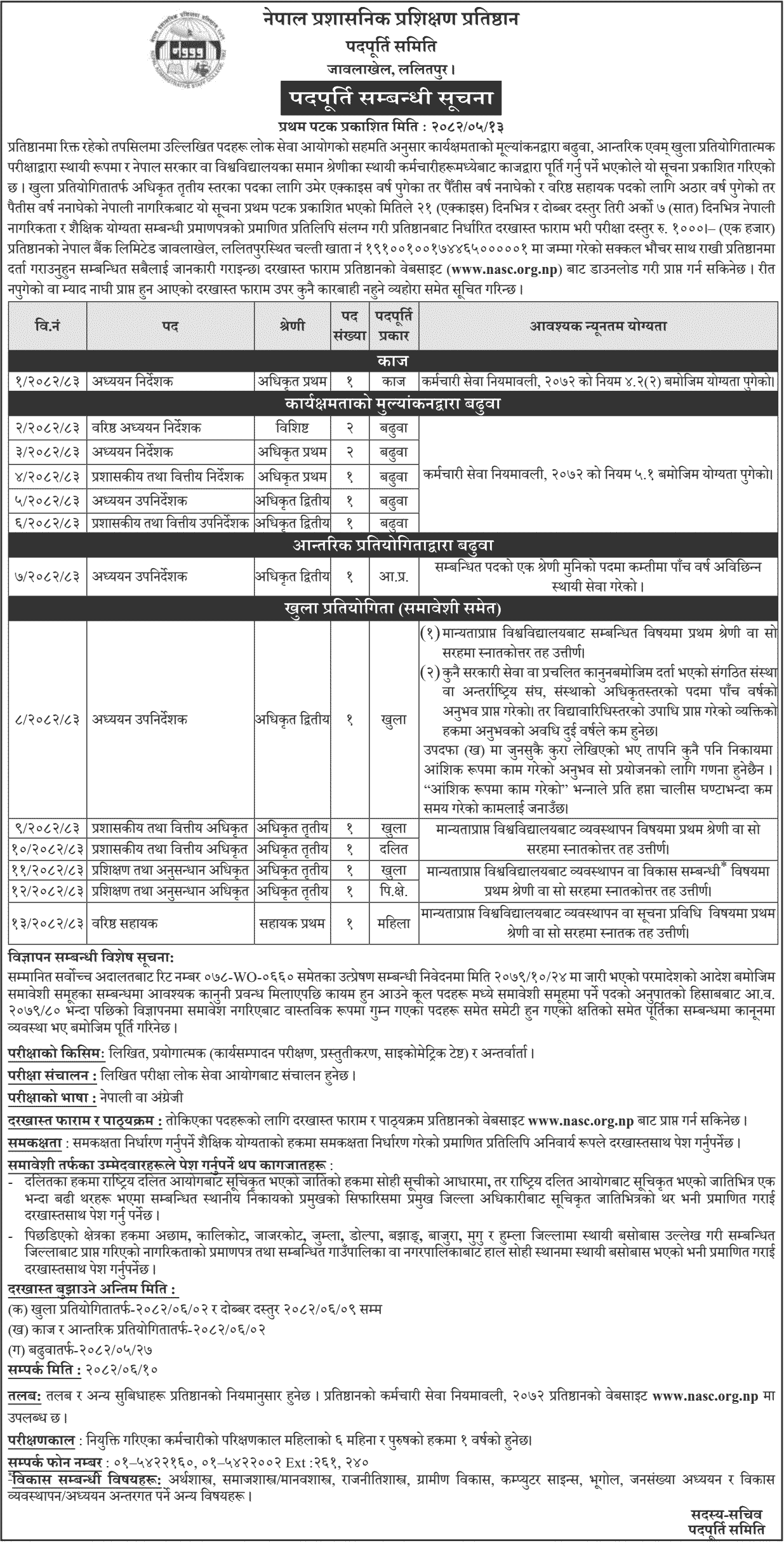 Senior Assistant, Training and Research Officer, Administrative and Finance Officer Full Time Lalitpur Posted 3 months ago Applications have closed Website Nepal Administrative Staff College JOB OPPORTUNITY Source: Gorkhapatra, 29 August, 2025 Tagged as: Lalitpur