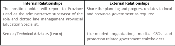 - Collaborate with provincial and cluster teams across health, governance, GEDSI and Innovation, Evidence and Learning (IEL) teams to ensure coherence, integration and responsiveness in GEDSI responsive education service delivery.