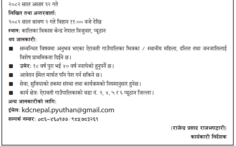 Social Mobilizer Full Time Puythan Posted 5 months ago Applications have closed Kalika Development Center Nepal JOB OPPORTUNITY Tagged as: Pyuthan