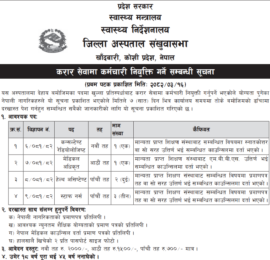 Staff Nurse, Health Assistant, Medical Officer, Consultant Radiologist Full Time Sankhuwasabha Posted 5 months ago Applications have closed Website District Hospital Sankhuwasabha JOB OPPORTUNITY