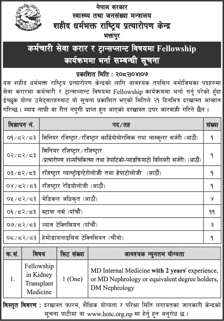 Staff Nurse, Lab Technician, Medical Officer, Hemodialysis Technician, Registrar Radiology, Registrar Gastroenterology and Hepatology, Senior Registrar / Registrar Full Time Bhaktapur Posted 4 months ago Applications have closed Website Shahid Dharmabhakta National Transplant Center JOB OPPORTUNITY Source: Gorkhapatra, 23 July, 2025 Tagged as: Bhaktapur