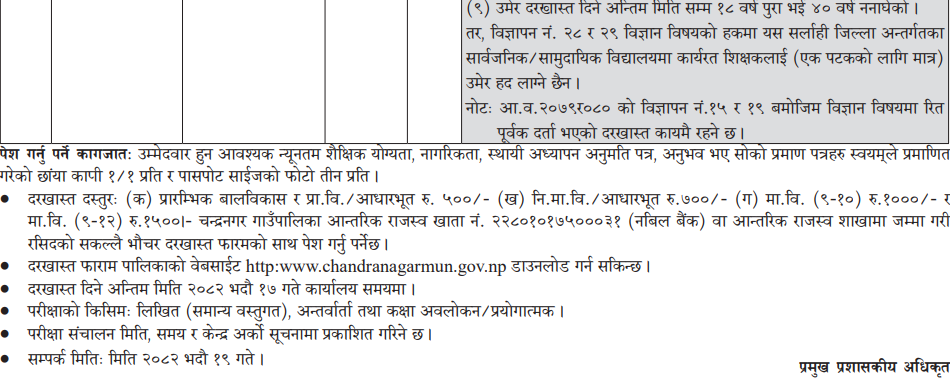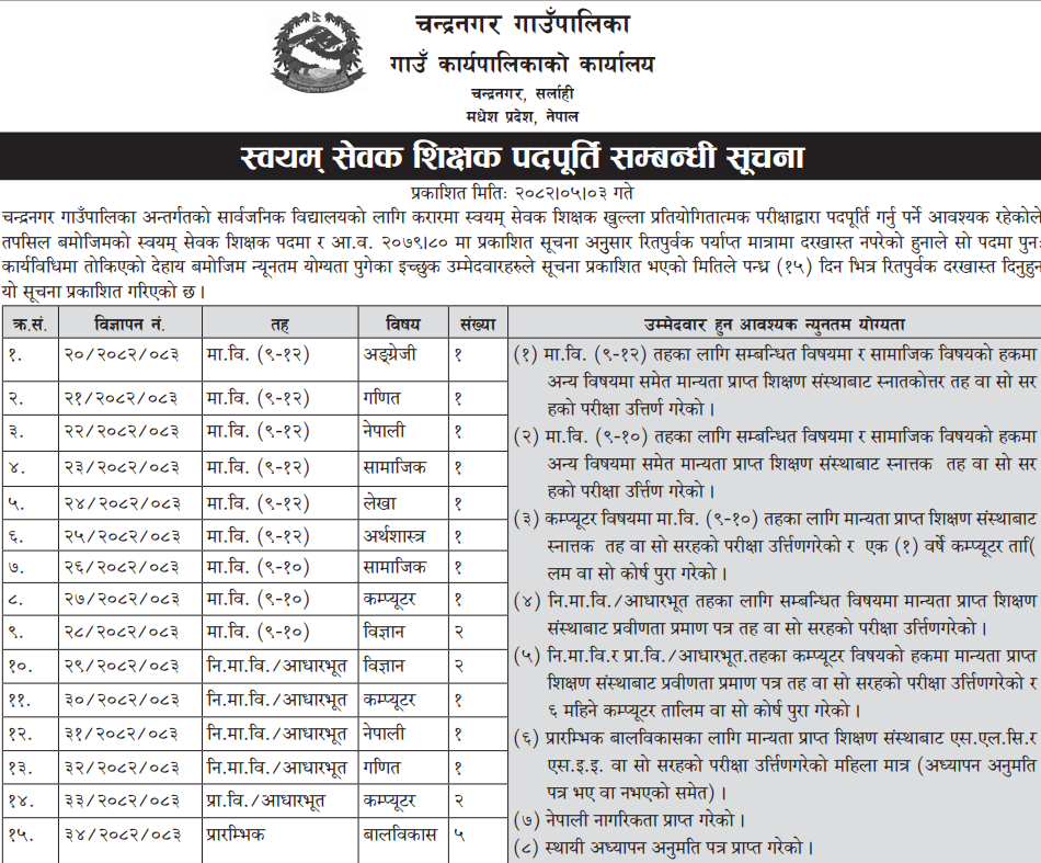 Teacher – English, Math, Nepali, Social, Account, Economics, Computer Full Time Sarlahi Posted 3 months ago Applications have closed Website Chandranagar Gaunpalika JOB OPPORTUNITY Tagged as: Sarlahi