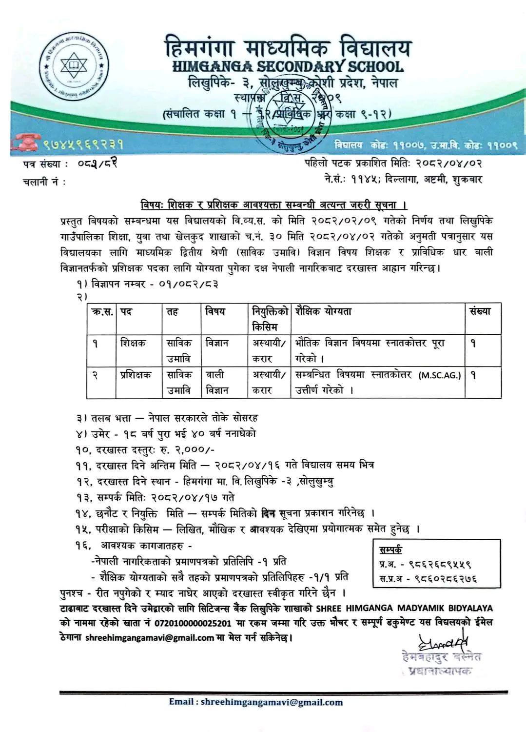 Teacher/Instructor – Science Full Time Solukhumbu Posted 4 months ago Applications have closed Himganga Madhyamik Vidyalaya JOB OPPORTUNITY Tagged as: Solukhumbu