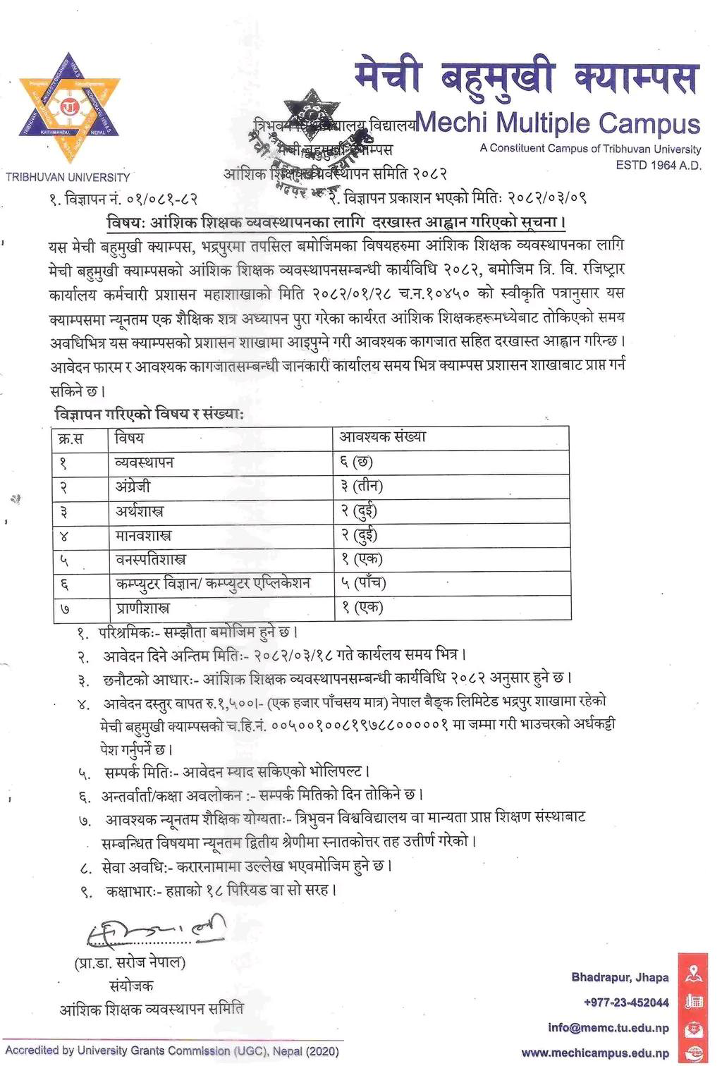 Teachers (Management, English, Economics, Anthropology, Botany, Computer Science) Part Time Jhapa Posted 5 months ago Applications have closed Mechi Multiple Campus JOB OPPORTUNITY