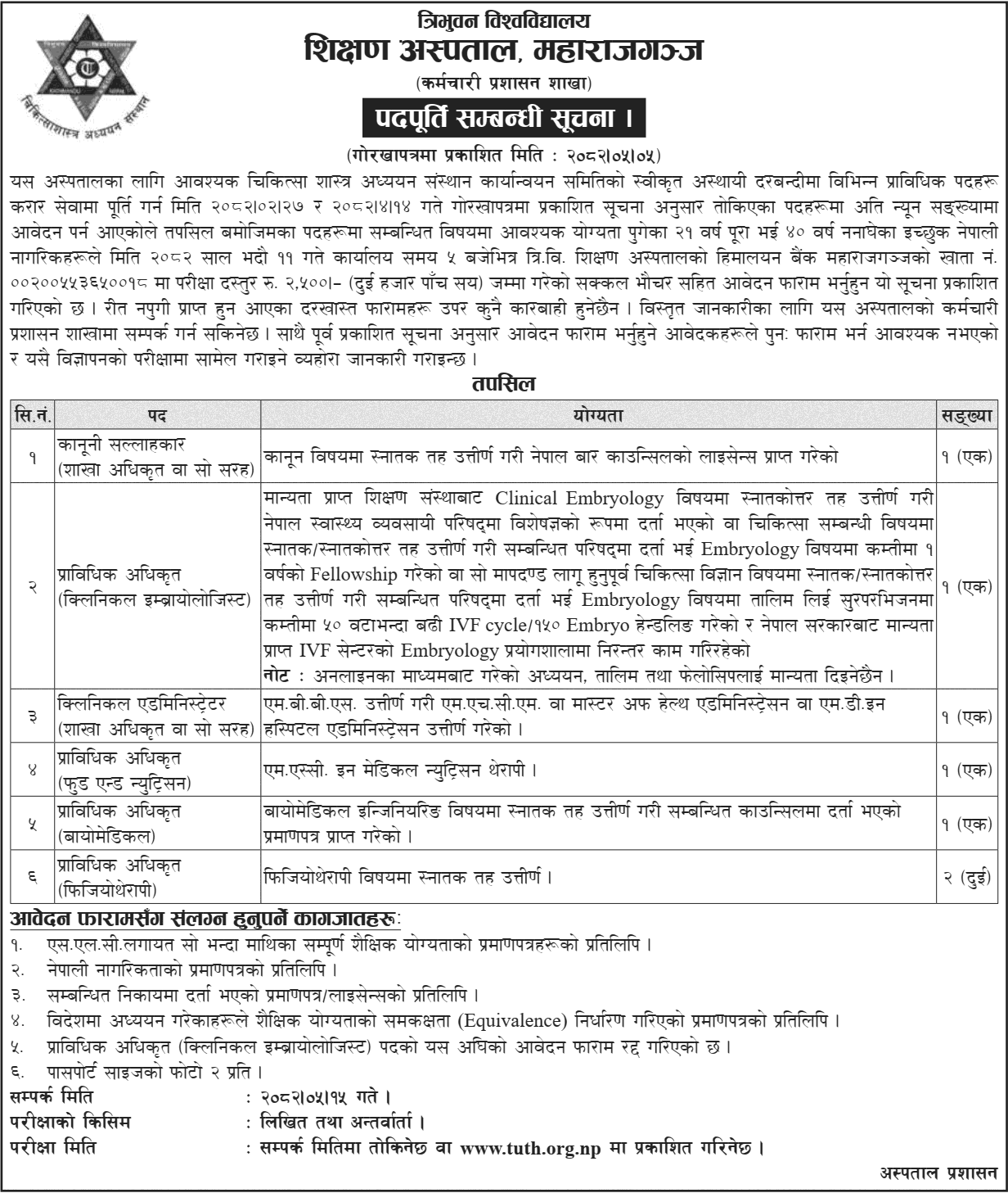 Technical Officer, Clinical Administrator, Legal Advisor Full Time Kathmandu Posted 3 months ago Applications have closed Website TU Teaching Hospital JOB OPPORTUNITY Source: Gorkhapatra, 21 August, 2025 Tagged as: Kathmandu